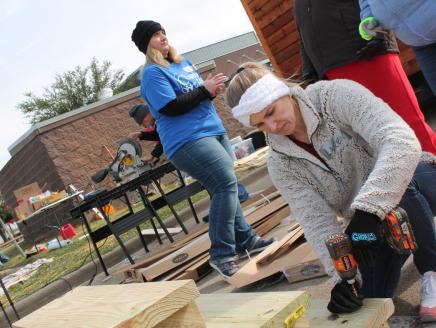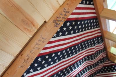 Volunteers assembled the newest tiny house outside our Garland-Jupiter banking center, installing floors, interior walls and exterior stairs. As part of a special tradition with each build, volunteers inscribed messages of thanks and support for the veterans receiving the home.