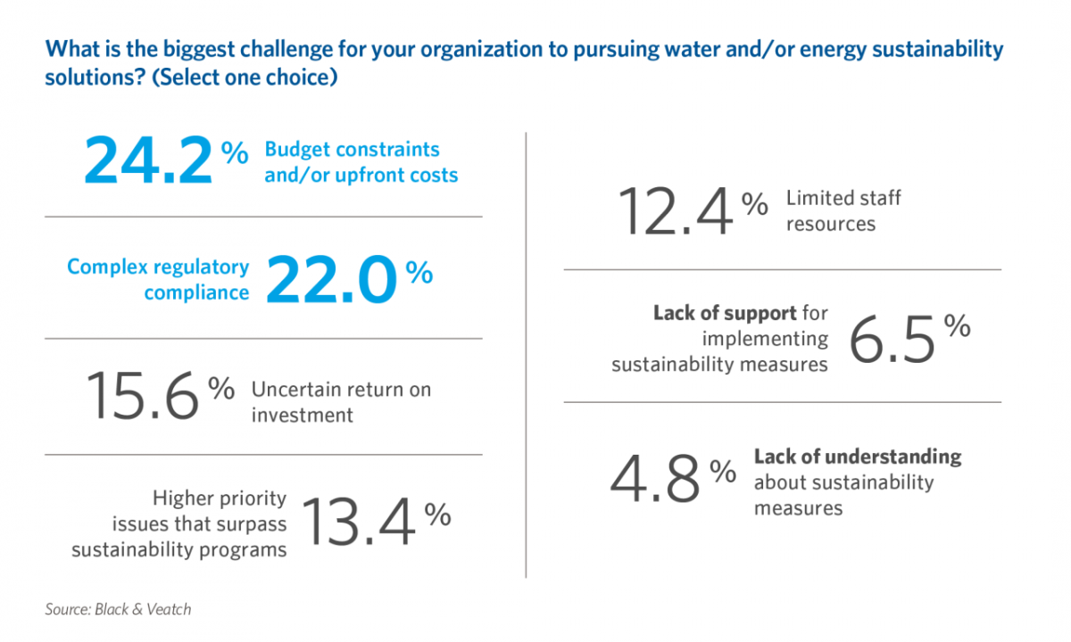 When it comes to barriers to broader adoption of sustainability solution, money still is proving to be the biggest obstacle. Black & Veatch’s survey found that roughly one of every four respondents cited budget constraints and upfront costs as being their biggest challenge in meaningfully improving their sustainability. More than one in five said the complexities of regulatory compliance were to blame, followed by “uncertain returns on the investment” – though it’s unclear if a respondent’s check on that box means he or she finds the return simply too low – and their focus on issues they deem more important.