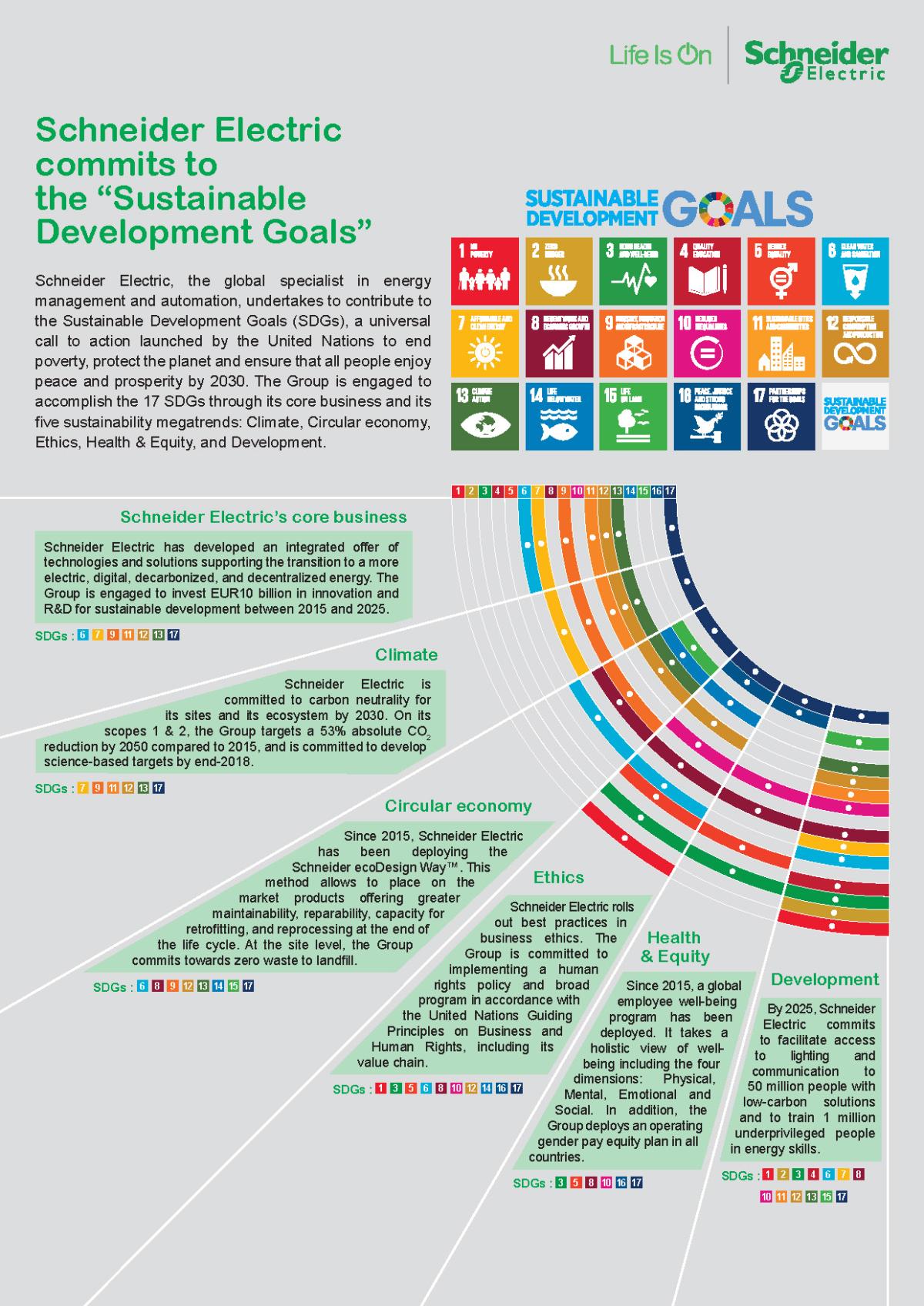 Schneider Electric contributes to the Sustainable Development Goals (SDGs), a universal call to action launched by the United Nations to end poverty, protect the planet, and ensure that all people enjoy peace and prosperity by 2030. We’re engaged to accomplish the 17 SDGs through our core business and five sustainability megatrends: Climate, Circular Economy, Ethics, Health & Equity, and Development.