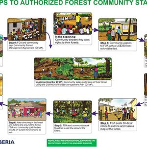 Commercial development of forest and mineral resources represents perhaps Liberia’s strongest opportunity to grow an economy that has stagnated at less than 1 percent annual growth since 2014. With many communities largely dependent on forests for food, shelter, medicines, cultural benefits, and livelihoods, supporting diversified use—including sustainable commercial activity—will be critical to meeting conservation objectives. While sometimes viewed as three different approaches, in reality the three Cs are not mutually exclusive. All three Cs can be implemented simultaneously within a given community forest, protected area, or commercial concession. The nine-step process to secure these rights is enshrined in the law and provides a framework for communities to fully understand their legal rights to manage community forests, resolve conflict, and identify sustainable uses.