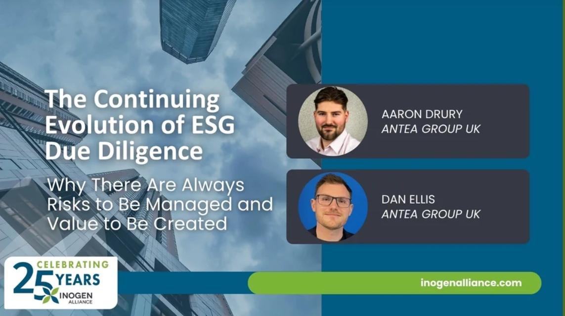 Through the global Inogen Alliance network, firms like Antea Group UK are helping companies navigate this evolving landscape by combining local expertise with global insight on sustainability and risk management. To explore how ESG due diligence is continuing to evolve, we spoke with Aaron Drury and Dan Ellis of Antea Group UK, who shared their perspectives on the drivers behind ESG risk assessment, the growing importance of resilience, and why ESG due diligence is increasingly about identifying opportunity as well as risk.