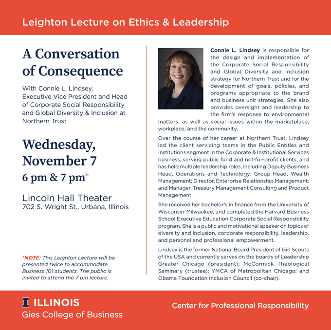 This year’s Leighton Lecture will feature Connie Lindsey, Executive Vice President and Head of Corporate Social Responsibility and Global Diversity & Inclusion at Northern Trust. The lecture titled “A Conversation of Consequence” will be presented on Wednesday, November 7 at 6pm and 7pm.