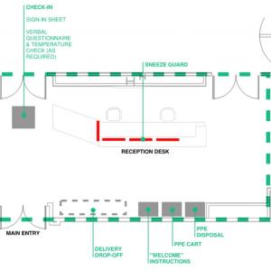 Consider re-tooling your office reception areas as health stations. This is where employees check in and out, complete health checks, learn about using the office safely, and receive supplies. The use of a health station is a necessary upgrade to ensure offices can maintain safety controls and contact tracing.