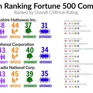 Berkshire Hathaway Inc. holds the lowest overall CSR rating, despite being listed fourth on the Fortune 500. “Berkshire has extremely low CSR scores across all subcategories,” Cynthia Figge, COO and Co-founder of CSRHub says. “They have 45 data sources, including all 13 of our major ESG analyst source databases, so this provides a strong signal of their perceived performance.”