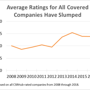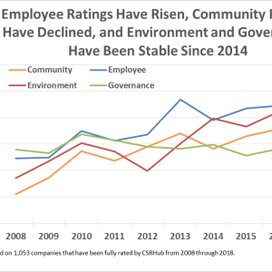 The chart below on Average CSRHub Ratings shows that since 2008, average ratings increased by almost 9 points to a peak in 2016. They fell somewhat over the last two years, but have still ended up by 6 points over ten years. Even from 2008 to 2010, through the worst of the Great Recession, ratings rose. The year-to-year changes are modest and gradual over time, suggesting there have been fundamental changes in business strategy for these companies during this period.