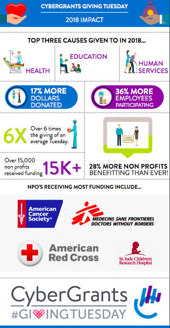 ANDOVER, Mass., November 30, 2018 /3BL Media/ -- CyberGrants, the global leader in Agile Social Impact technology, is thrilled to announce another record breaking #GivingTuesday. Nearly one-third of all corporate giving and grantmaking is processed via CyberGrants, so their results are a good barometer for the corporate world’s impact on Giving Tuesday.