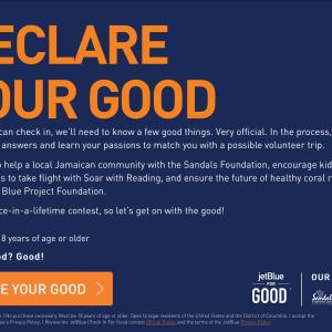(a.) No purchase necessary. Must be 18 years of age or older. Registration ends 11:59:59pm PT on 11/10/2017. Open to legal residents of the United States and the District of Columbia. All volunteers must accept the official rules and JetBlue's privacy policy. Review the JetBlue Check In For Good contest Official Rules, and the terms of the JetBlue Privacy Policy.