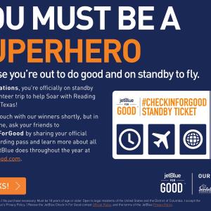 The first 2,000 entrants who #CheckInForGood will receive donation codes to donate to a charity of their choice at globalgiving.org/jetblue. Entrants who are selected as winners from the “standby” list for one of the volunteer trips will be notified of their eligibility on a rolling basis through November 20, 2017.