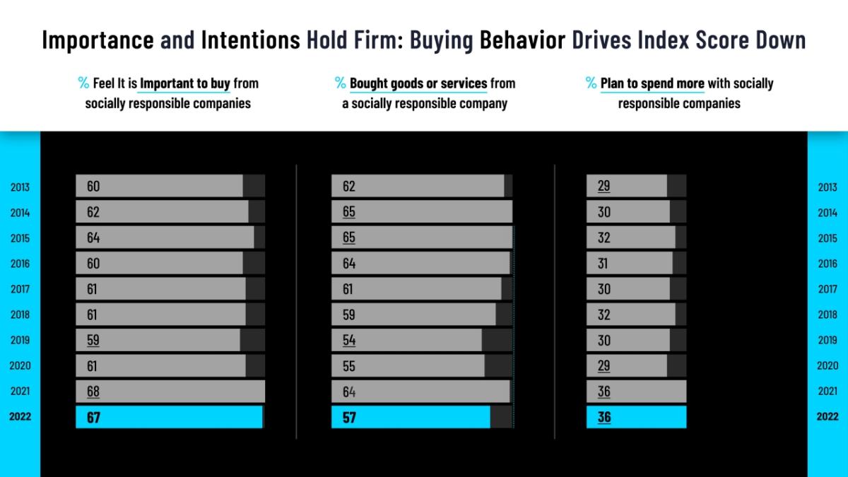 This decrease in purchasing power resulted in only 57 percent of Americans reporting they purchased goods from socially responsible brands in 2022, down from 64 percent in 2021 and 62 percent from the inaugural index results in 2013.