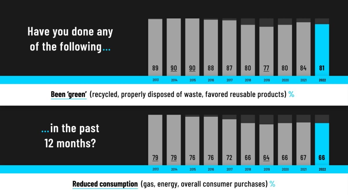 In less fortunate news, 89 percent of Americans reported being green in 2013, but only 81 percent confirmed this behavior in 2022. Meanwhile, only 66 percent of consumers said they reduced their consumption of gas, energy and purchases in 2022, compared to 79 a decade ago. Even more alarming, those who made financial contributions to a nonprofit dropped by 20 percent from 2013 to 2022.