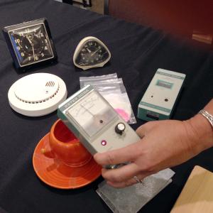 Sandy Sewell swept a Geiger counter over each item. The radiation-detection needle ticked up a little passing over the smoke detector, a little more with the alarm clocks, but then jumped to 40 counts per minute above the cup and saucer. Sewell placed a thin sheet of steel over the dinnerware, and the needle dropped immediately.