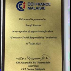 5 winners of the CCIFM Excellence Award 2016 were announced during the dinner and Sanofi Pasteur won the Corporate Social Responsibility Award for our the Dengue Patrol initiative. Other award categories in the CCIFM Excellence Award included the Outstanding Achievement for large companies, Outstanding Achievement for SMEs, Image of France and the France-Malaysia Smart Partnership.