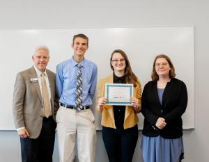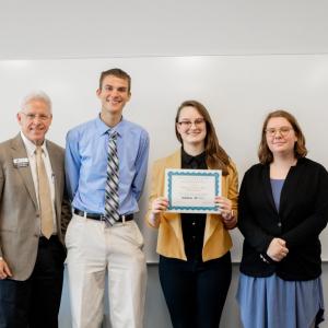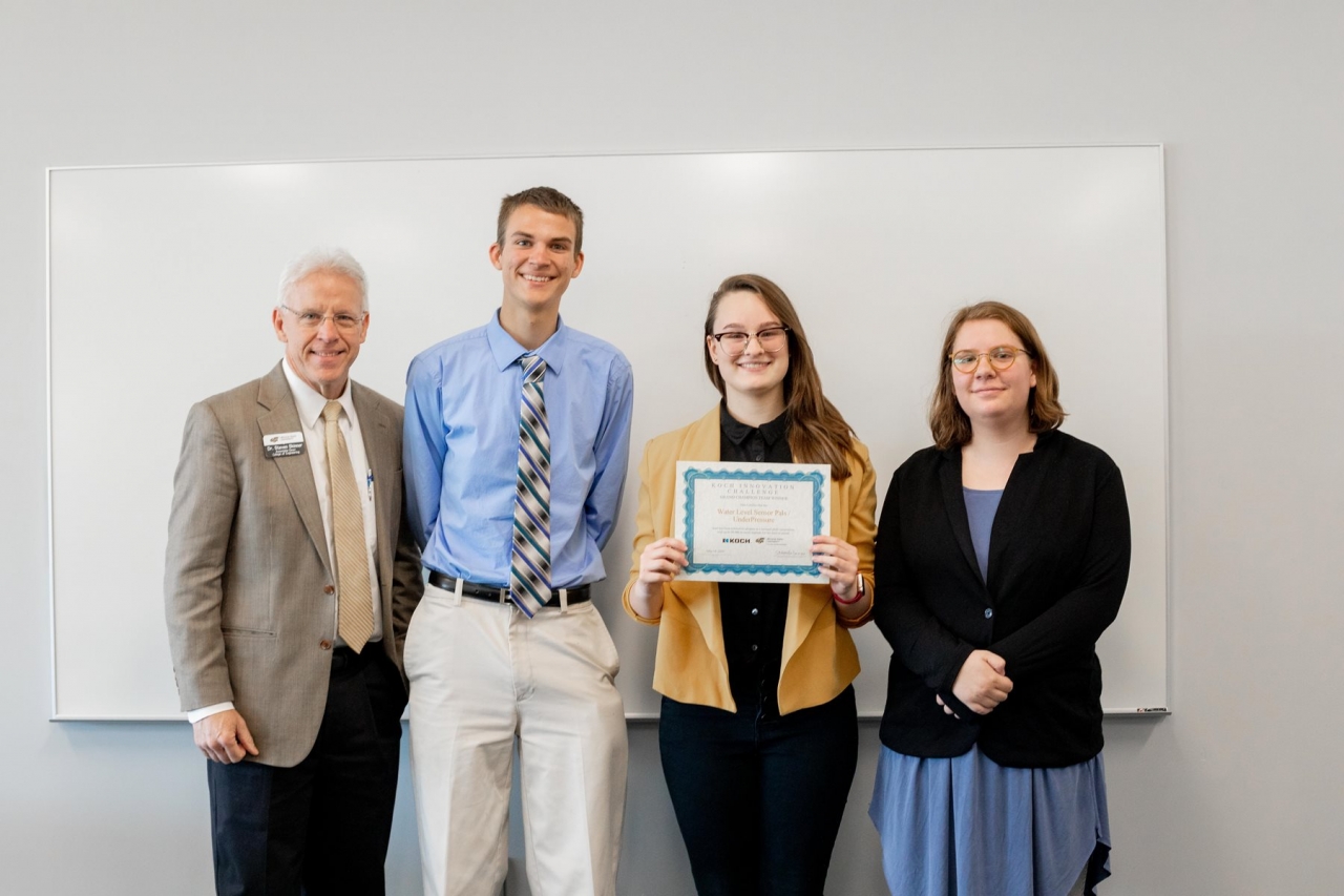 In Friday’s final pitch competition (May 10) at Wichita State University, members of Team Water Level Sensor Buddy (Cierra O’Neill, Edie Reese, Jedidiah Borchard and Tyler Thompson) managed to claim the title of Grand Champion over four other finalist teams with their invention – an all-mechanical, magnet-based tool for the visually impaired to help measure fluid levels when filling up water bottles or drinking glasses.