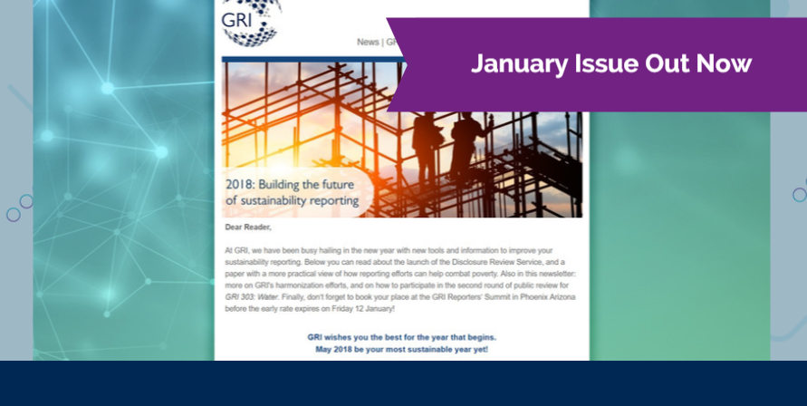 GRI has been busy hailing in the new year with new tools and information to improve your sustainability reporting. In this January issue, you can read about the launch of the Disclosure Review Service, and a paper with a more practical view of how reporting efforts can help combat poverty. Also in this newsletter: more on GRI's harmonization efforts, and on how to participate in the second round of public review for GRI 303: Water. Finally, don’t forget to book your place at the GRI Reporters’ Summit in Phoenix Arizona before the early rate expires on Friday 12 January!