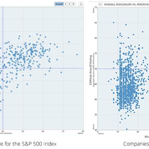 A comparison of charts from our new Bloomberg app (ESGHub) indicates that big companies disclose more information than small ones. The chart on the left shows the distribution of disclosure for the S&P 500 Index. There is a wide dispersion of disclosure profiles (as measured by Bloomberg’s ESG Metrics on the bottom axis) and CSRHub’s consensus ESG rating (as shown on the vertical axis). The chart on the right shows about 1,500 companies from the NASDAQ 3,000. There are some companies spread out on the right. However, many companies are clustered to the left with low disclosure scores.