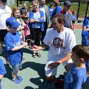 Drew Butera and Chris Young of the Kansas City Royals presented new baseball gloves to Miracle League of Kansas City participants. The event was held on April 23 as part of the Players Trust’s City Clinics program.