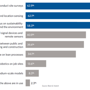 Construction with an eye for sustainability and the environment remains among the top-of-mind challenges in the industry, with 58 percent of respondents saying their region has applied that approach. Other innovations remain relatively slow to come despite their acknowledged potential.