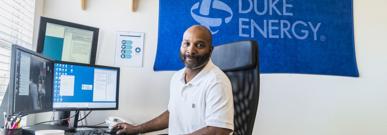 In addition, offices must have a locking door and a locking cabinet or drawer to store any customer data. Weatherspoon, who has worked for Duke Energy since 2012, has a locking filing cabinet for his documents and placed his workspace in front of the window.