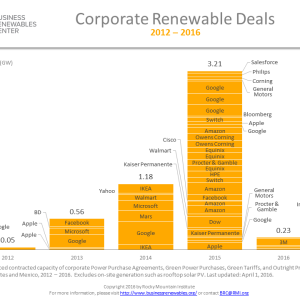RMI’s Business Renewables Center has been focusing on growing renewable procurement through corporations’ appetite to contract large amounts of electricity. Corporate deals for large-scale renewables have been growing fast, from 0.56 gigawatts in 2013, to 1.18 in 2014, to 3.21 last year. Companies now lead the demand for wind power and are an increasingly important source of demand for solar, too.