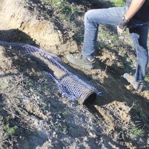 The materials were standard fare from your local hardware store: black perforated plastic drainage hose, chicken wire, a wooden box, sand and a 5-gallon lidded plastic bucket. The hard part was the work — digging the T-shaped trenches then refilling them after the burrow was installed.