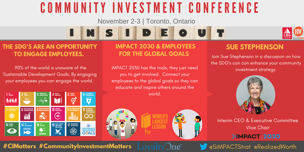 TORONTO, October 16, 2017 /3BL Media/ - Sue Stephenson, Interim CEO and Executive Committee Vice Chair of IMPACT 2030, will speak to "Why the SDG's are an Opportunity to Engage Employees" at the upcoming Toronto conference Inside Out: A Transformative Approach to Community Investment.