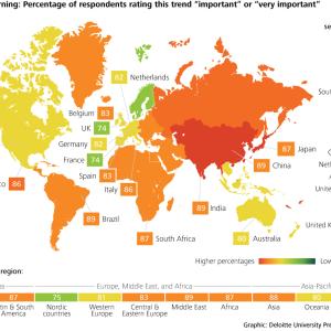 Learning continues to be important to HR and business executives worldwide as they strive to adapt to the disruptive change that is sweeping through corporate learning and development organizations. (See figure 1 for our survey respondents’ ratings of learning’s importance across global regions and selected countries.) Several factors are driving the demand for change that has accelerated to warp speed over the past year.