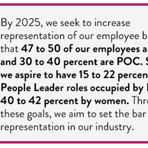 Today, we are improving access to training and educational resources on leadership, racism, unconscious bias, and well-being to ensure our workplace is regularly incorporating the learnings into behavior. We are also continuing to invest in early-in-career and mid-career development and training to develop commercial skills and career building for people of color (POC) and women.