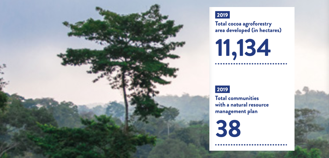 One-third of trainees were women and there are now 31 Community Resource Management Committees set up across four larger areas covering over 20,000 hectares. We also provided Climate Smart Agricultural training to 50 percent of farmers in Hershey’s supply chain and distributed shade trees to all farmers in the program. In October 2019, Hershey received an award in recognition of our efforts and leadership toward Ghana’s REDD+ implementation of the Ghana Cocoa Forest REDD+ Program for our work in Kakum.