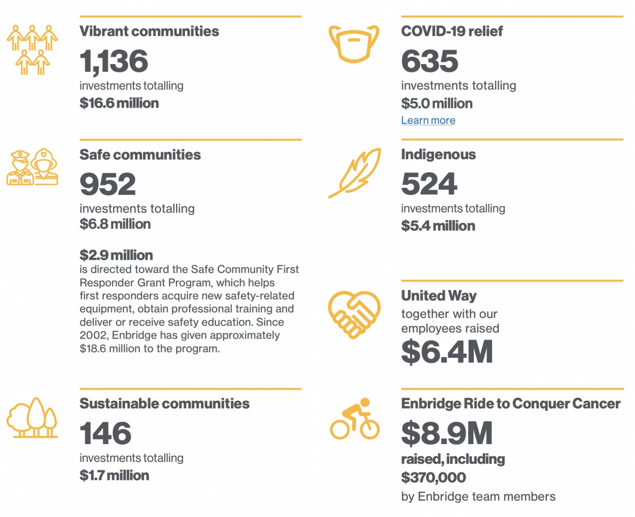 We invested $25.2 million1 in 2,239 community-strengthening initiatives across North America in 2020. See above for the breakdown across our pillars and priorities. See, as well, our interactive community investment map for a sampling of these investments.