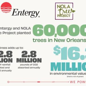 “Entergy’s support has been invaluable in the number of trees we have planted and given away through our Big Treesy program and other tree-related initiates,” said Connie Uddo, executive director of NOLA Tree Project. “In addition to charitable contributions, Entergy employees are among 90,000 volunteers our organization has engaged in community improvement initiatives resulting in more than $10 million in economic impact to the city since our inception in 2006. We could not have reached our 60,000th tree milestone without the help and support from Entergy.”