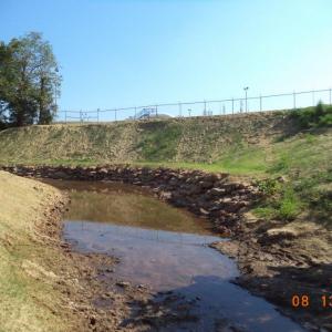 After the rock had been installed and the top soil was replaced, side slopes were hydro-mulched with Flexterra (a proprietary erosion control medium that can be sprayed in placed) to prevent erosion and facilitate the growth of natural vegetation.