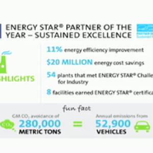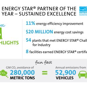 Since being recognized as an ENERGY STAR® Partner of the Year in 2012, GM has worked to improve its energy performance. The number of plants that met the ENERGY STAR® Challenge for Industry jumped from 30 to 54; the company earned ENERGY STAR® certification for two assembly plants, four warehouses and an office building.