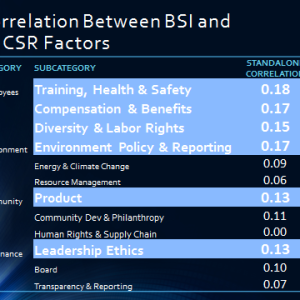 That 2006 study – conducted just six years before the CSRHub study – barely qualified for statistical significance. So the fact that the CSR/brand correlation reached .28 so fast is a very big deal. Of course, we used different databases back then. CSR outside the US wasn’t being tracked by US firms so our numbers were domestic only. The CSRHub study combined global data from Brand Finance, the UK brand value company, and CSRHub’s aggregated global information. Still, the rise was extraordinary.