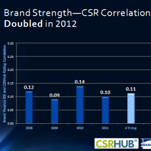 This week, Cynthia Figge, Co-founder and COO of CSRHub (full disclosure: CSRHub is my sponsor), reported at Sustainable Brands that the correlation between CSR and brand strength has reached .28. (A perfect correlation is 1.0)