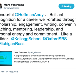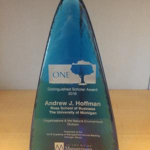 One of four Distinguished Scholars, Erb Institute faculty member, Andrew Hoffman was awarded this honor in the Organizations and the Natural Environment Division.