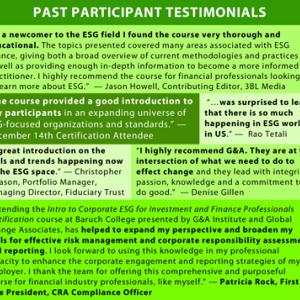Lecturers include leading experts in the sustainable investing field and the session participants will come away with an understanding of why corporate ESG matters in investing, and how to apply ESG factors to corporate valuations; analysis of reputation, risk, opportunity and other aspects of financial analysis.