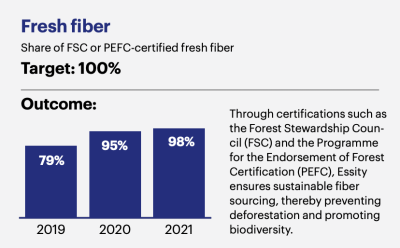 Our long-standing work with responsible fiber sourcing is an important part of our sustainability strategy to support sustainable forestry and thereby promote biodiversity. We ensure sustainable fiber sourcing through certifications such as the Forest Stewardship Council (FSC) and the Programme for the Endorsement of Forest Certification (PEFC) and can therefore prevent deforestation and promote biodiversity in the forest. Every FSC-certified forest must be assessed by an accredited FSC certification body each year. Essity works with and encourages non-certified suppliers and forest owners to become certified. This secures our own sourcing of certified materials while increasing the availability of certified raw materials to other users. In order to further promote responsible forestry on global, regional and national levels, Essity is supporting the development of international certification systems.