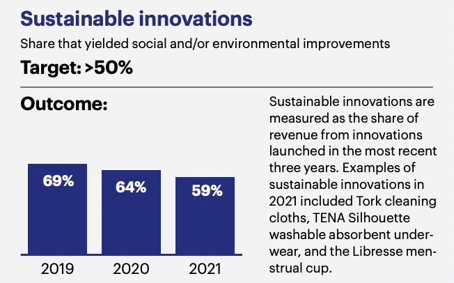- Sustainable solutions: We act to develop new and more sustainable products and services. Our offering now includes reusable menstruation and incontinence products. Through innovation, Essity has reduced the greenhouse gas footprint in the company’s different product categories by 10–30% over a ten-year period. Essity’s Group target is that at least 50% of the company’s innovations are to yield social and/or environmental improvements. In 2021, the outcome was 59%.