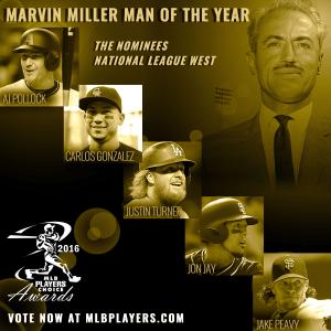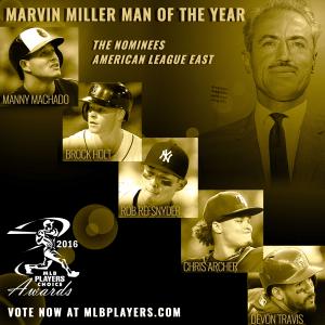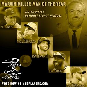 Major Leaguers on each team have selected one teammate as their Club’s nominee for the 2016 Marvin Miller Man of the Year Award. Now it’s the fans’ turn to help the Players choose the 2016 Marvin Miller Man of the Year