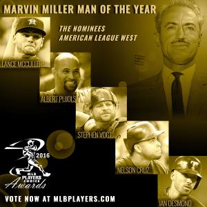 NEW YORK, September 13, 2016 /3BL Media/ – Online balloting at www.MLBPlayers.com opened today so fans can select the six finalists for the 2016 Marvin Miller Man of the Year award, which goes to the player whose on-field performance and contributions to his community most inspire others to higher levels of achievement.