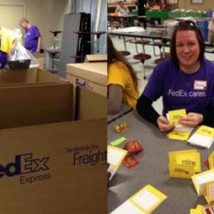 In the midst of Super Bowl XLVII weekend excitement in New Orleans, FedEx volunteers joined a group of nearly 100 volunteers, along with some of the New Orleans Saints players, at De Salle High School in support of the 2nd Annual Super Basket of Hope to help fill 250 baskets and totes with gifts for hospitalized children and their parents. This event was hosted by Basket of Hope, created in 1995, that provides gift baskets and hope totes to children diagnosed with cancer or other serious illnesses. This year, the organization will deliver gift-filled baskets and totes to children and their families at over 18 hospitals across the nation.