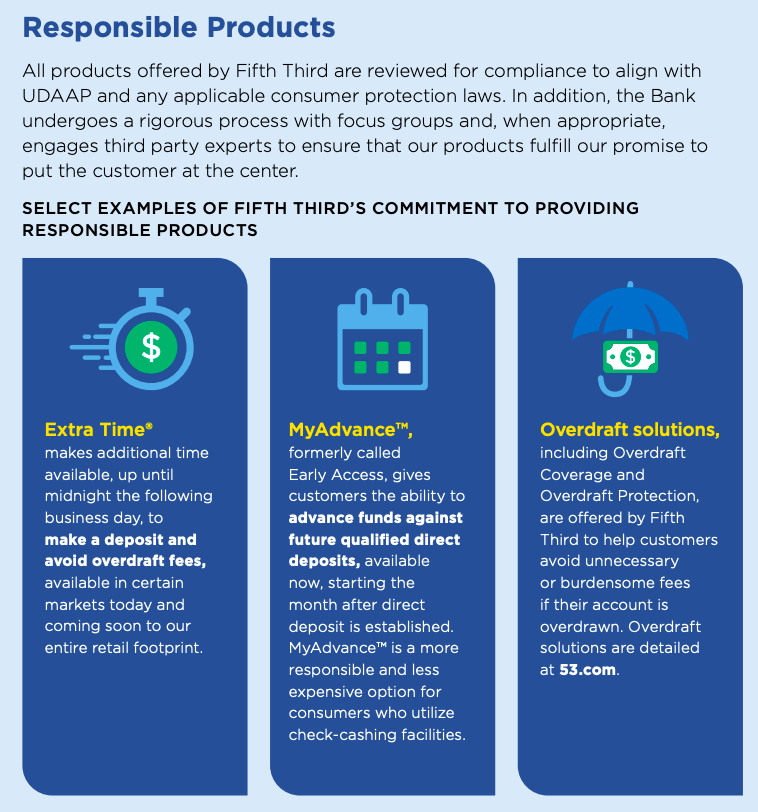 All products offered by Fifth Third are reviewed for compliance to align with UDAAP and any applicable consumer protection laws. In addition, the Bank undergoes a rigorous process with focus groups and, when appropriate, engages third party experts to ensure that our products fulfill our promise to put the customer at the center.