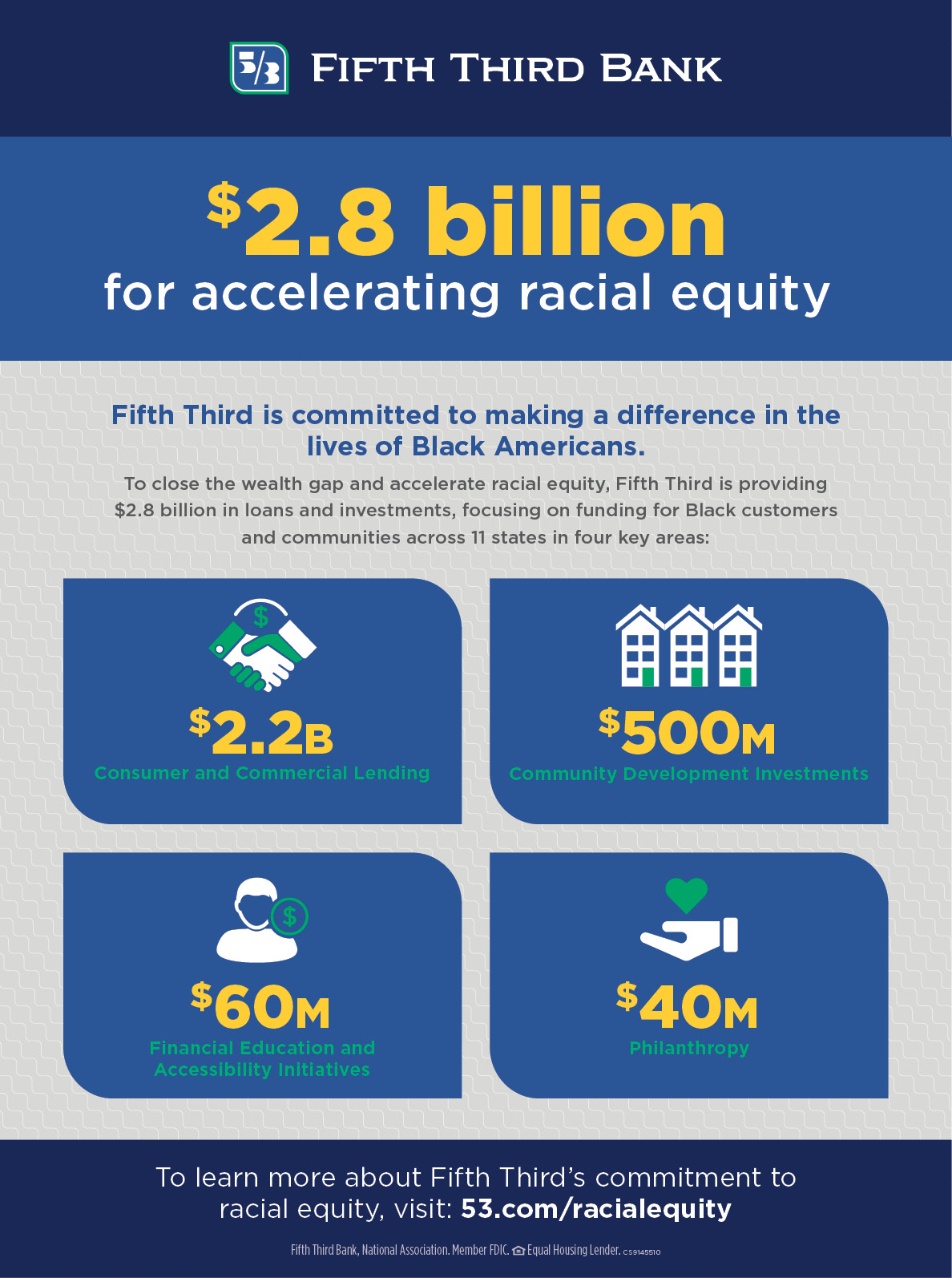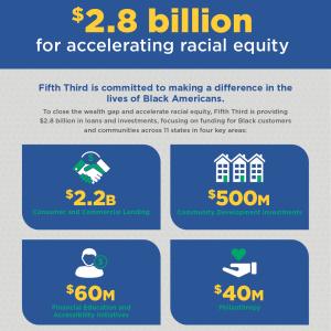 “As we continue to make meaningful strides in advancing inclusion and diversity in our industry and in our communities, Fifth Third is committed to maintaining and extending its leadership and making a difference for our Black customers, communities and employees,” said Greg Carmichael, Chairman and CEO. “The dedicated investment, philanthropy and lending efforts will help accelerate our progress toward promoting equality, equity and inclusion, both within the Bank and in our communities, launching with a $2.8 billion commitment.”