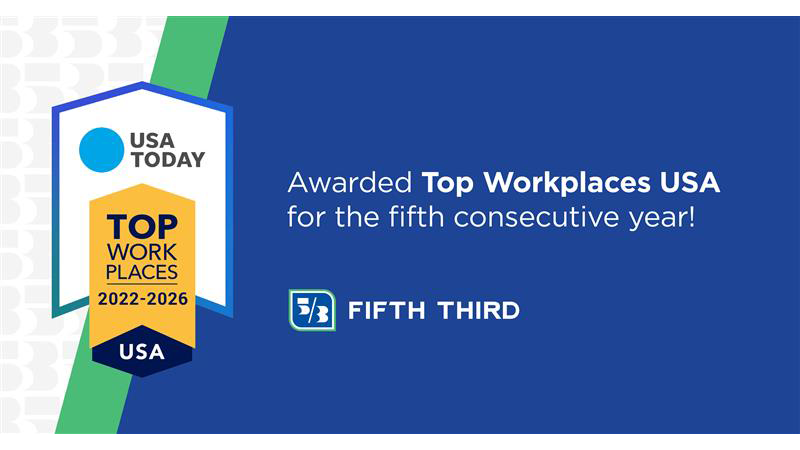 CINCINNATI, April 9, 2026 /3BL/ - For the fifth consecutive year, Fifth Third (Nasdaq: FITB) is honored to have earned the 2026 USA TODAY Top Workplaces award. Fifth Third also received Top Workplaces Culture Excellence Awards in the following categories: Appreciation, Employee Well-Being, Innovation, Leadership, Professional Development, Purpose & Values and Work-Life Flexibility. The Culture Excellence Awards showcase where an organization's people-first culture excels to boost brand reputation and attract talent that aligns with organizational values.
