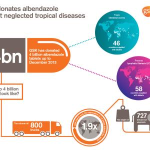 What would it take to eliminate a disease like lymphatic filariasis (LF), a leading cause of permanent disability worldwide? We hope to find out. So far, GSK has donated four billion tablets of albendazole to fight LF and intestinal worms -- enough medicine to fill 800 container trucks. Our albendazole has reached over 600 million people -- nearly 200 million of whom are children -- since the start of our donations in 2000. With leadership from the World Health Organization (WHO), we aim to donate as much albendazole as required to treat the 1.3 billion people who are at risk from this mosquito-borne disease. We also donate albendazole to treat school children at risk of intestinal parasites that can cause physical, nutritional and cognitive damage.
