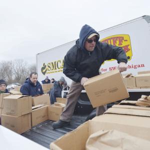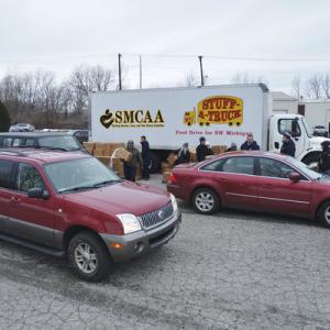 BENTON HARBOR — Hundreds of vehicles sat Thursday along the streets of downtown Benton Harbor, all angled toward a bustling warehouse that was packed with food.