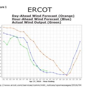 While this is an important step toward achieving a clean energy future, successfully integrating this large amount of renewable generation into the current U.S. transmission system – in a safe and reliable manner – is currently a monumental challenge. The intermittent nature of both wind and solar challenges our ability to fully depend on these resources. As we see in Figure 1, not only is wind energy variable, but it can also defy forecasting – even “hour-ahead” forecasting.