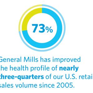 - Health improvements: General Mills has improved the health profile of 73 percent of its U.S. Retail sales volume since 2005. In fiscal 2013 alone, the company improved nearly 20 percent of its U.S. Retail sales volume. Nutritional improvements touched all General Mills U.S. Retail platforms, including Baking, Cereal, Dairy, Meals and Snacks.