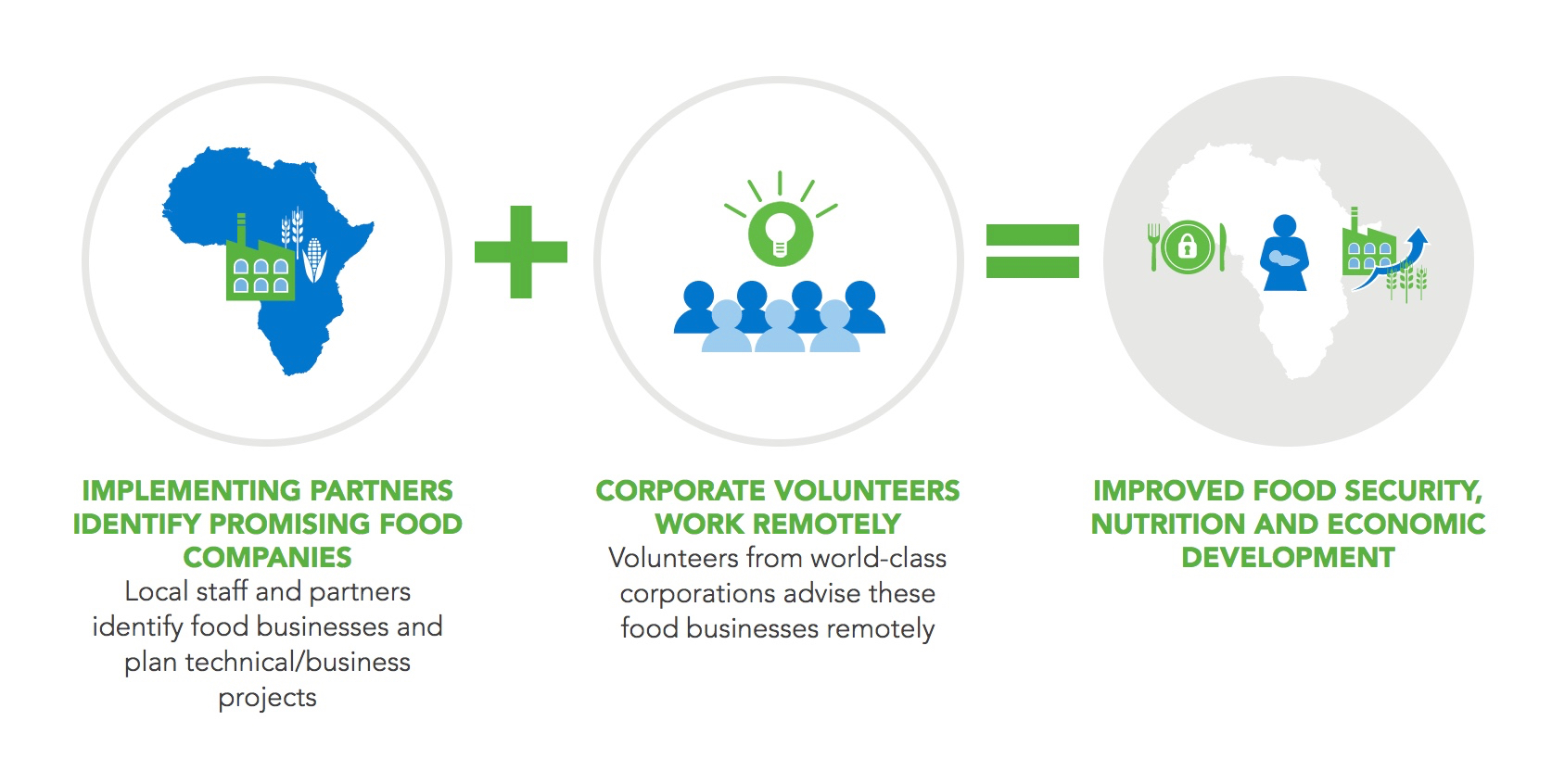 Expert volunteers from leading food companies like General Mills share their knowledge with promising African food processors to overcome challenges.