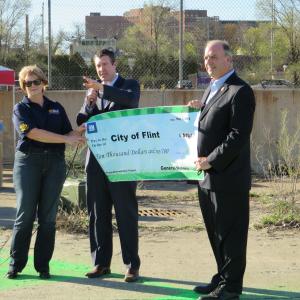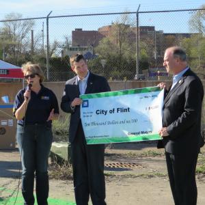 FLINT, Mich., May 6, 2013 /3BL Media/ – Two days after announcing plans to purchase the first Durant-Dort Carriage Company factory in Flint, the automaker presented Flint city leaders with $10,000 to purchase and plant trees this spring on the nearby Chevy in the Hole manufacturing site.